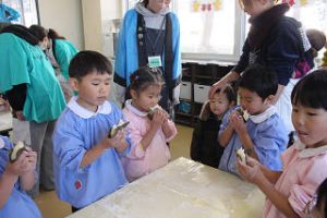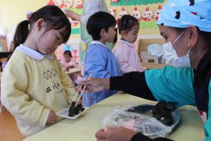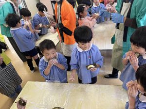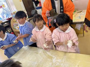 つばめさんとすみれさんはついたお餅を実際に触って、丸い形にしました♪